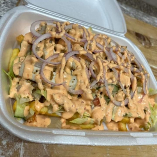 Gyros hús (15dkg), sültburgonya (25dkg), jégsaláta, uborka, paradicsom, hagyma, választható öntet (csípős, joghurtos, tzatzikis, kapros, ezersziget) ,,amit megjegyzésben jelezhetsz felénk "
