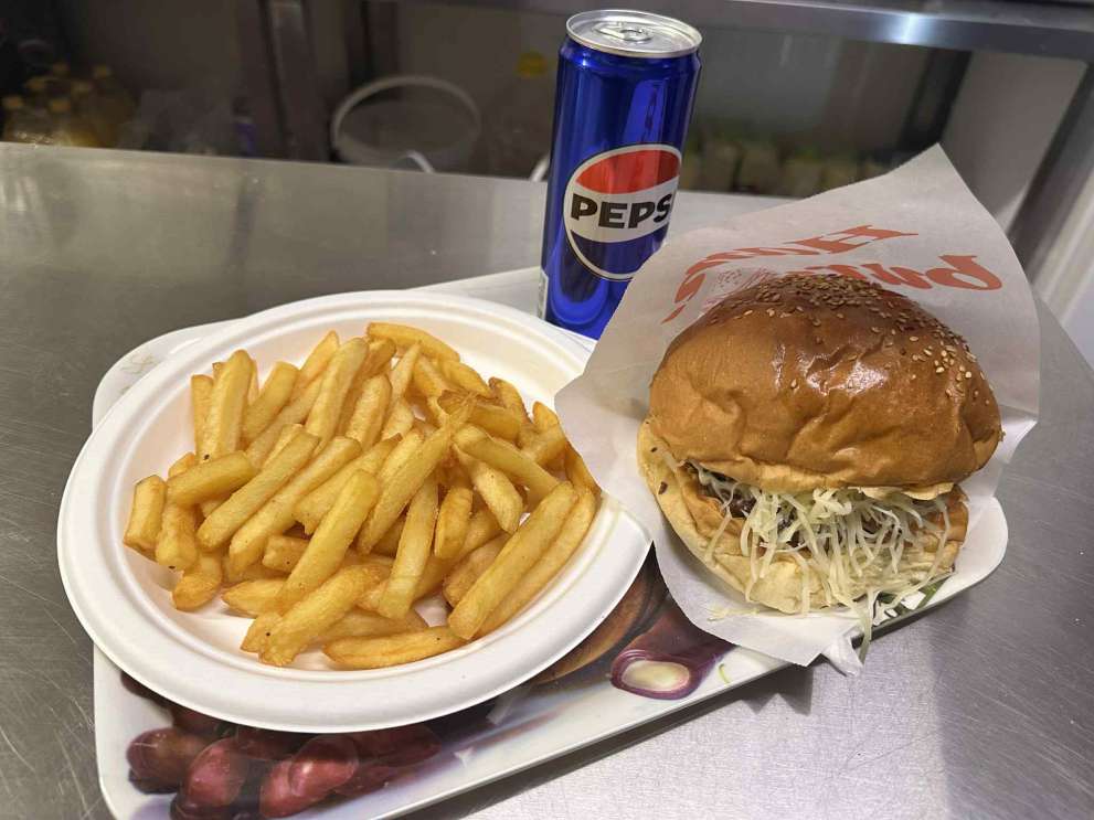 Hamburger zsemle, saláta, marha vagy csirke hamburger hús, hagyma, uborka, paradicsom, kechup, majonéz, mustásr, trappista sajt, 250 g sültburgonya, 1db 0,33 dl üdítő