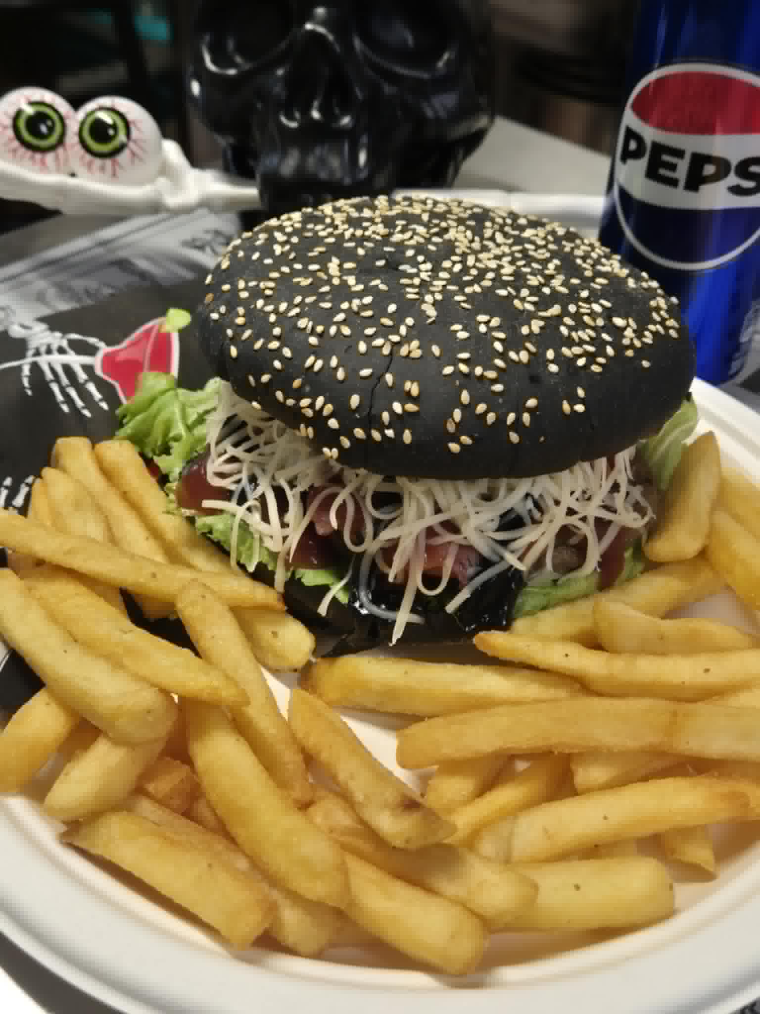 Fekete hamburger zsemle, saláta, marha vagy csirke hamburger hús, hagyma, uborka, paradicsom, bacon, kechup, fekete majonéz, mustásr, trappista sajt, 250g sültburgonya, 1db 0,33dl Pepsi