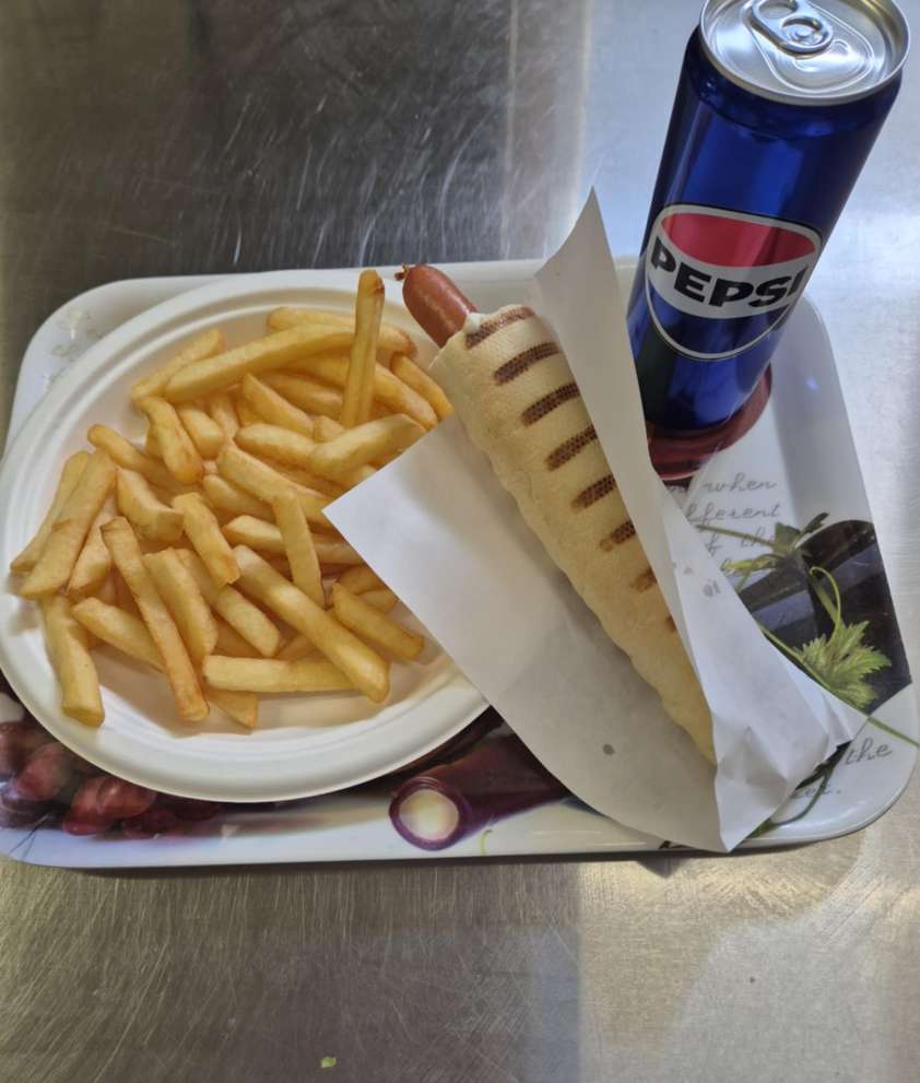Hot-dog kifli, virsli, kechup, mustár, majonéz vagy kérheted hamburger szósszal is. 25 dkg sültburgonya, 1 db 0,33dl üdítő.