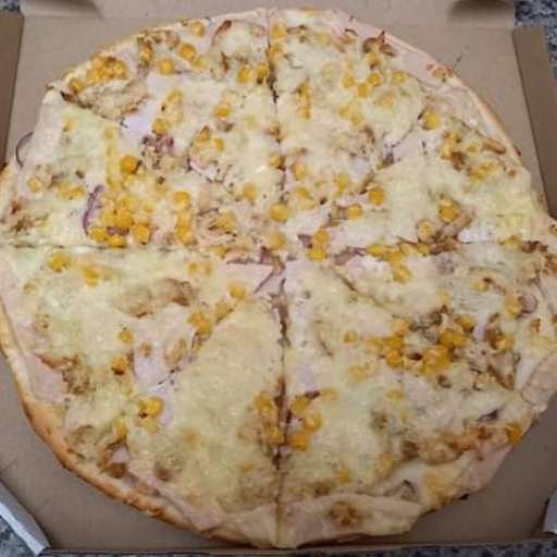 Fokhagymás tejfölös alap, lilahagyma, sonka, gyros hús, kukorica, trapista sajt