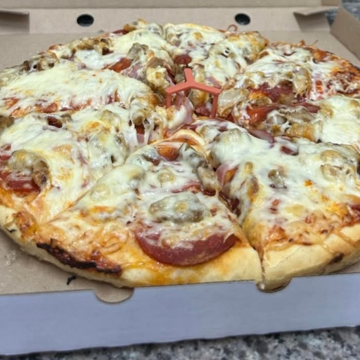 Paradicsomos alap, hagyma, sonka, gyros hús, szalámi (sima,csípős), füstölt tarja, kukorica, trapista sajt