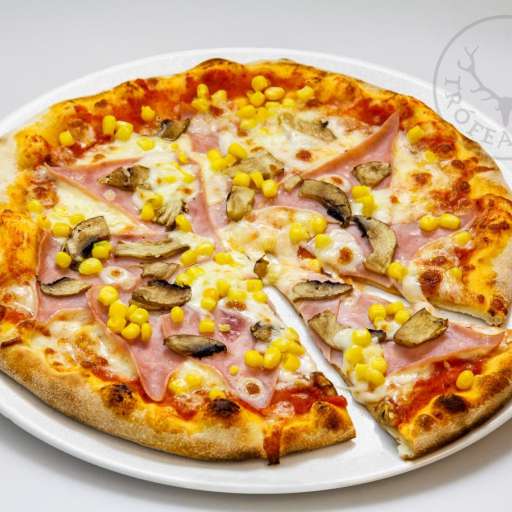 Paradicsomos alap, hagyma, sonka, gomba, kukorica, trapista sajt
