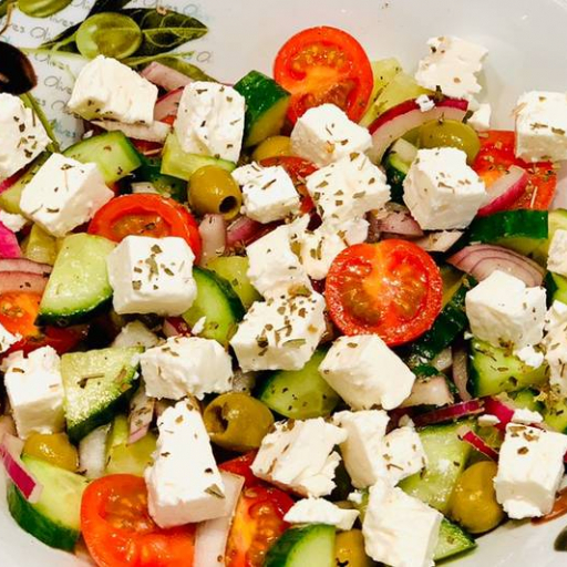 Jégsaláta, paradicsom, uborka, hagyma, feta sajt, olivabogyó, oliva olaj