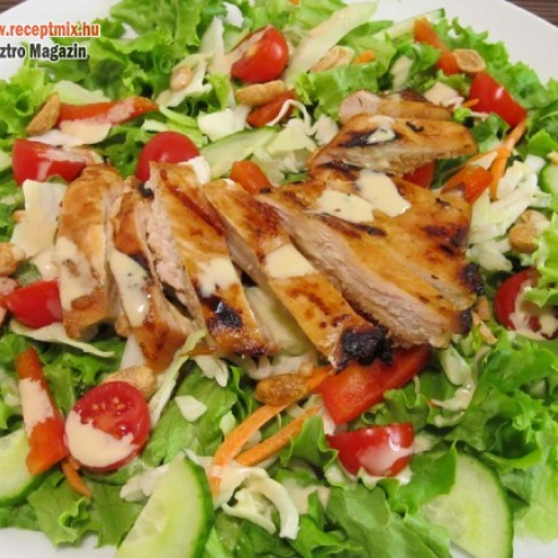 Jégsaláta, uborka, hagyma, paradicsom, panírozott csirkemell csíkokra vágva,trapista sajt, Választható öntetek